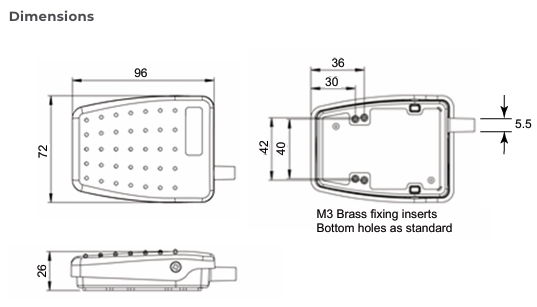 Aan de onderzijde van de voetschakelaar zijn M3 inserts aanwezig. Door deze M3 inserts kan het veilig worden bevestigd op een bedieningspaneel, vloerplaat of op een machineframe.